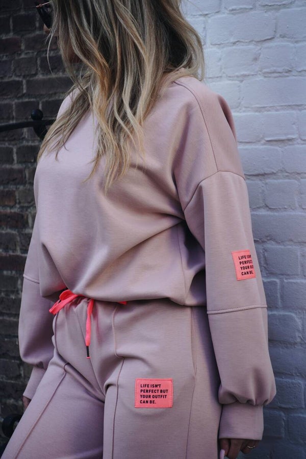 Deze stijlvolle comfy set in zacht oud roze is perfect voor dagen waarop je comfort én een leuke outfit wilt combineren. De set bestaat uit een heerlijke sweater en een bijpassende broek, afgewerkt met een speelse roze patch die de look een subtiele, trendy twist geeft.